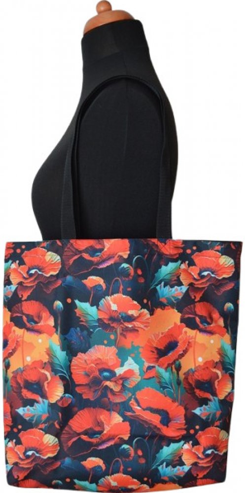 Přední strana tašky je s motivem vlčích máků, zadní strana černá.