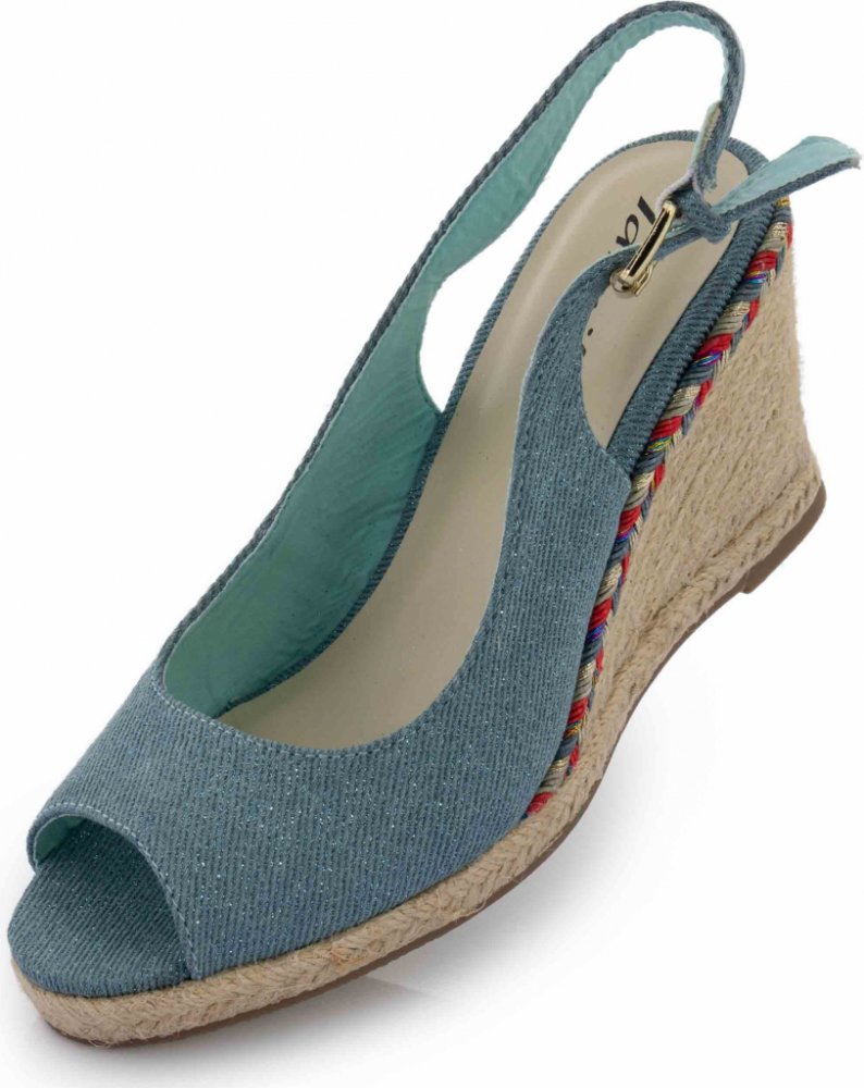 Dámské letní sandály Tamiko s otevřenou špičkou Dámské letní sandálky Tamiko mají otevřenou špičku a pásek okolo paty. Svrchní textilie je protkaná jemnou blýskavou nití a dodává tak botám příjemný nenápadný lesk. Klínový podpatek je lemovaný přírodním vláknem, krásně prodlužuje nohy a zeštíhluje siluetu, a pohodlně se díky němu chodí. Sandálky v tomto provedení lehce nazujete a zkombinujete s šaty, sukní či šortkami. Materiál: Textil, syntetika, pryž