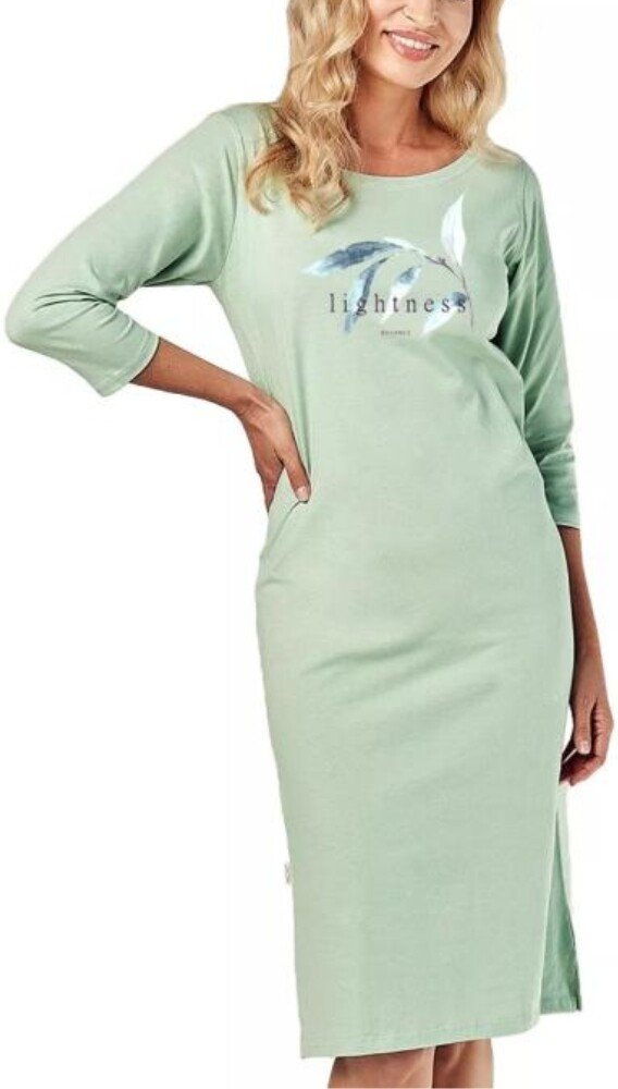 Dámská noční košile Olympia 2996/31 TARO v světle zelené barvě přináší pohodlí a styl během spaní. Košile je zdobená motivem listů a nápisem „lightness BALANCE“, který dodává jemný a moderní vzhled. Pro výrobu byla použita 100% bavlna, která je známá svou měkkostí a prodyšností. Tento materiál zajišťuje příjemný pocit na pokožce a ideální komfort během celého noci. Noční košile má tříčtvrteční ruk...