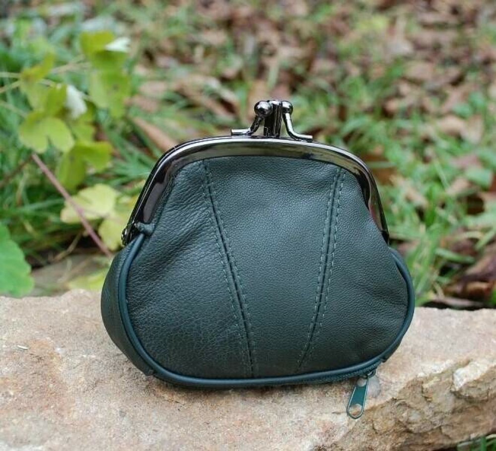 Dámská zelená malá peněženka na mince z kůže, případně různé drobnosti, ozdobně štepovaná, tmavé kování, dvě samostatné složky s kovovým uzávěrem a malá kapsa na zip.