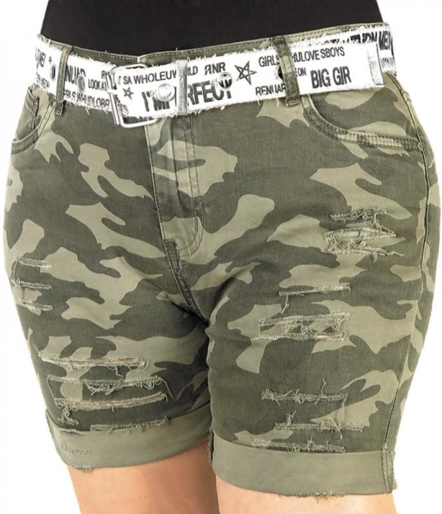 Popis: Dámské maskáčové elastické kraťasy ve stylovém provedení "roztrhané". Krátké elastické kalhoty s riflovým designem. Vpředu 2 hluboké zapuštěné kapsy a jedna malá. Vzadu 2 kapsy. Pevný pas s poutky na opasek. Spodní část kraťasů vyhrnutá a ukončena zapošití. Přední část roztrhána, vzadu ne. Celkový dojem: Dámské kraťasy na způsob dámské maskáčové krátké roztrhané rifle.