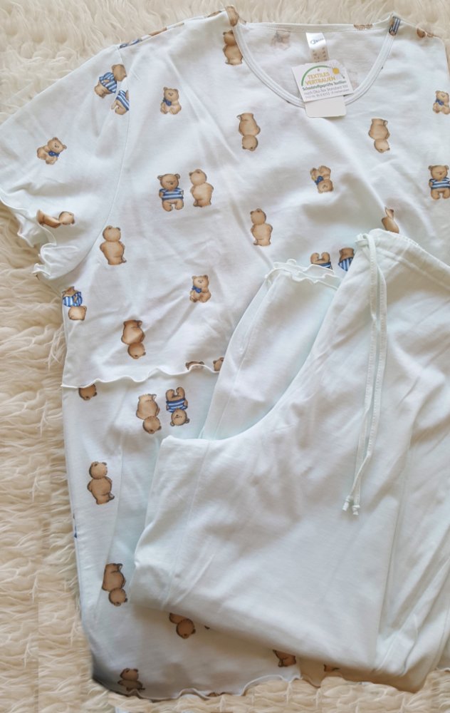 Pyžamo se nabízí ve světle modré barvě (pouze nádech do modra) ve velikosti 46 (šírka trika volně 60cm).
