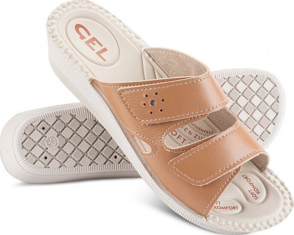 Pohodlné dámské pantofle v elegantní koňakové barvě na doma i do města. S regulovatelnými pásky na suchý zip. Měkká gelová stélka a polyuretanová podrážka pro vaše pohodlí. Materiál: eko kůže, syntetika, polyuretan V případě váhání mezi dvěma velikostmi doporučujeme zvolit tu větší.