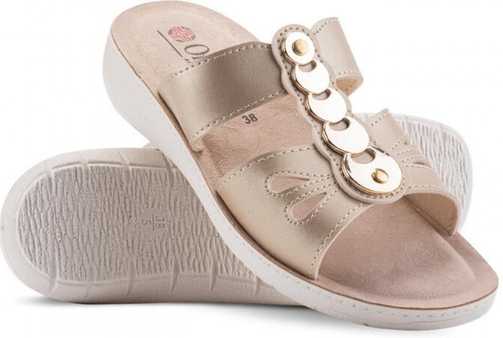 Krásné vycházkové pantofle jsou jako stvořené do letních dnů. Anatomickou stélku z příjemného broušeného materiálu ocení především vaše chodidla, výrazné zlaté zdobení podtrhne vaši jedinečnost. Mírný klínek zajistí správné držení těla. Vhodné i na domácí chození. Materiál: eko kůže, syntetika, polyuretan V případě váhání mezi dvěma velikostmi doporučujeme zvolit tu větší.