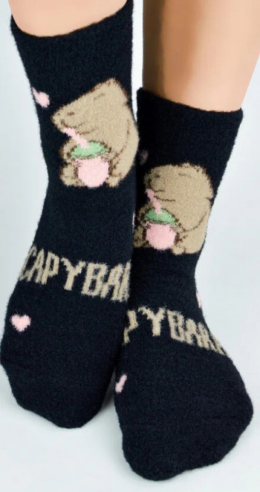 Extra jemné měkké ponožky pro dámy a velké dívky, jsou chlupaté, jemně počesané, vzor – kapybara, mají jemný patent a jsou velmi příjemné na dotek. Jsou vhodné k nošení na doma namísto bačkůrek nebo do bot na chladnější.