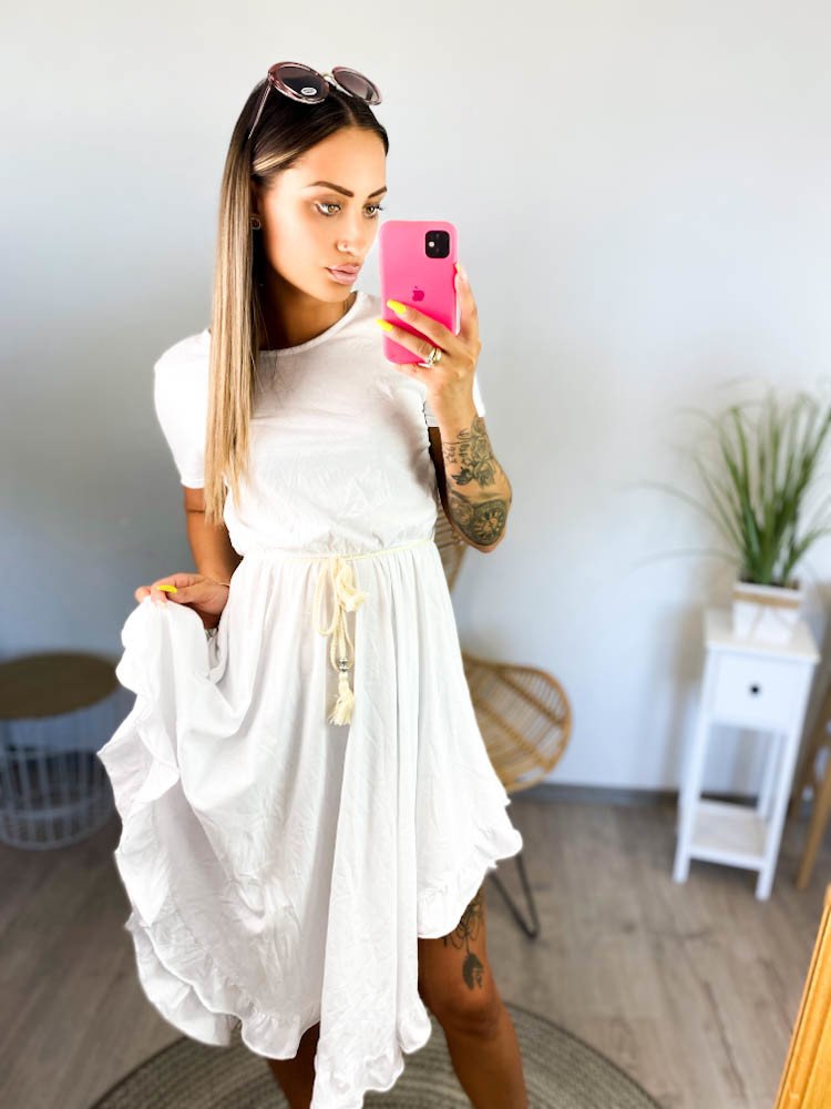 BARVA: bílá VELIKOST: uni MATERIÁL: 100% bavlna Romantické šaty v bílé barvě jsou na našem e-shopu jako současná NOVINKA. V pase jsou doplněny šňůrkou v přírodní barvě. Jsou zajímavě navrženy a střiženy. Skvělý materiál zaručuje pohodlí a pohodlí během nošení. Šaty mají krátký rukáv. ROZMĚRY: Celková délka: 120 cm Šířka přes prsa: 48 cm
