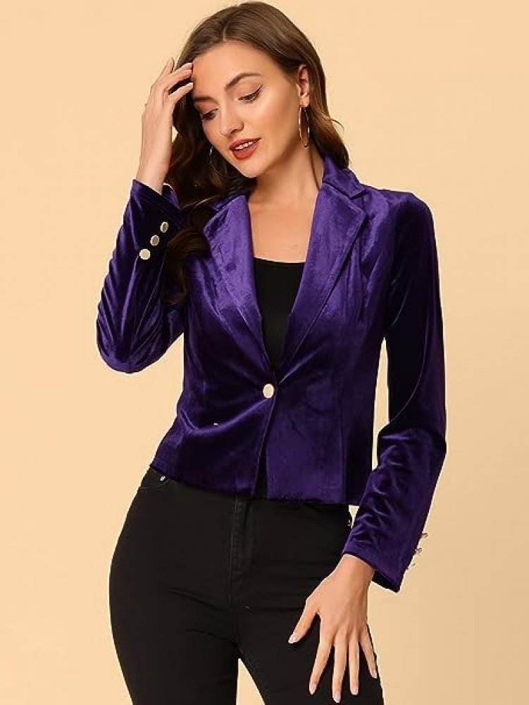 Sametová tkanina, jednořadá, pravidelný střih, vroubkovaná klopa, dlouhý rukáv, dekor knoflíků na manžetách, ležérní elegantní sako