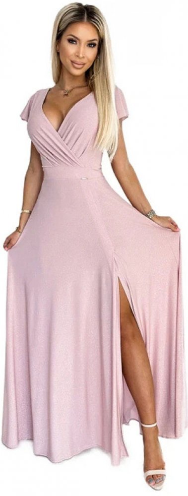 Dámské šaty, které zaujmou na první pohled! Elegantní dlouhé šaty CRYSTAL v něžné růžové barvě s jemným třpytem podtrhnou vaši ženskost a dodají vám sebedůvěru na každém kroku. Obálkový výstřih krásně tvaruje dekolt, třpytivý materiál se leskne při každém pohybu a rozparek na sukni se postará o pohodlné nošení i během večerního tance.