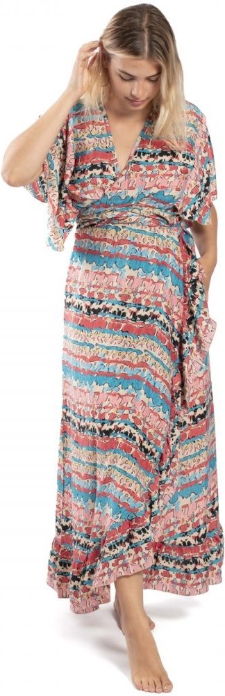 Vzdušné a velmi slušivé šaty v délce ke kotníkům. Přední díl je kratší, obvod šatů se díky zavazování v pase snadno přizpůsobí vaší postavě. Šaty jsou ušity z velmi příjemného a odolného umělého hedvábí. Rádi je doporučíme ženám, které mají běžnou velikost S, M a L. Obvod hrudníku je 90 cm, ale lze jej díky zavazování upravit. Délka šatů v zadní části je od ramen 135 cm.Vzory na šatech mohou být s...