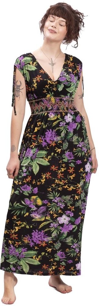 Dlouhé filigree šaty jsou ušité z pružného splývavého materiálu, mezi ženami velmi oblíbeného. V dekoltu a na zádech střižené do písmene „V“, šířka ramínek 15 cm a po stažení provázků na 4 cm, umožní nošení ženám i s plnějším poprsím. Žabičkování má 60 cm v pase a po roztažení 100 cm, jeho šířka je 8 cm. Délka ke kotníkům (měřeno od ramen) je 130 cm. Rádi doporučíme ženám, které mají běžnou velikost S,M a L. Vykročte si s radostí v našich dlouhých šatech, které i na dešti rychle schnou a vyznačují se vysokou odolností barev, prostě neblednou! Už teď se v nich budete cítit jako řecká bohyně Afrodita.