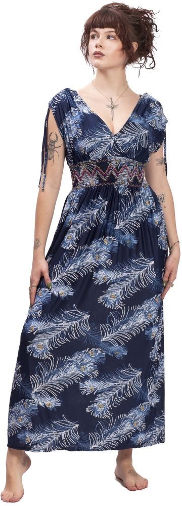 Dlouhé filigree šaty jsou ušité z pružného splývavého materiálu, mezi ženami velmi oblíbeného. V dekoltu a na zádech střižené do písmene „V“, šířka ramínek 15 cm a po stažení provázků na 4 cm, umožní nošení ženám i s plnějším poprsím. Žabičkování má 60 cm v pase a po roztažení 100 cm, jeho šířka je 8 cm. Délka ke kotníkům (měřeno od ramen) je 130 cm. Rádi doporučíme ženám, které mají běžnou velikost S,M a L. Vykročte si s radostí v našich dlouhých šatech, které i na dešti rychle schnou a vyznačují se vysokou odolností barev, prostě neblednou! Už teď se v nich budete cítit jako řecká bohyně Afrodita.
