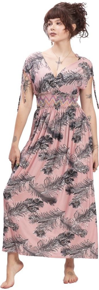 Dlouhé filigree šaty jsou ušité z pružného splývavého materiálu, mezi ženami velmi oblíbeného. V dekoltu a na zádech střižené do písmene „V“, šířka ramínek 15 cm a po stažení provázků na 4 cm, umožní nošení ženám i s plnějším poprsím. Žabičkování má 60 cm v pase a po roztažení 100 cm, jeho šířka je 8 cm. Délka ke kotníkům (měřeno od ramen) je 130 cm. Rádi doporučíme ženám, které mají běžnou velikost S,M a L. Vykročte si s radostí v našich dlouhých šatech, které i na dešti rychle schnou a vyznačují se vysokou odolností barev, prostě neblednou! Už teď se v nich budete cítit jako řecká bohyně Afrodita.