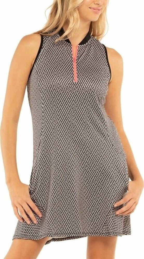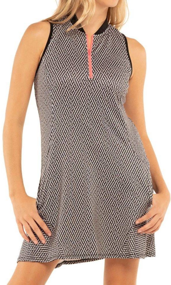 Dámské šaty bez rukávů. Jediné, které s vámi dokážou držet krok. Tyto šaty nabízejí čistou sofistikovanou siluetu jako vy. Díky elegantní černé barvě a celoplošnému šrafovanému potisku na hřišti určitě zaujmete. Racerback střih na zádech. Čepelovitě řezaný malý límeček se zapínáním na výrazný ¼ zip.