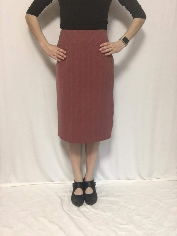Rovná sukně se sedlem, v levém boku zip a rozparek.Sukně je vypodšívkovaná.