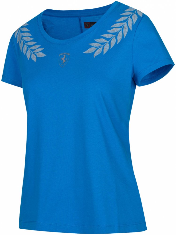 Sportovní elegance s nádechem historie. Dámské tričko Ferrari Laurel Wreath v sytě modré barvě spojuje klasický styl s odkazem na závodní dědictví značky Ferrari. Výrazným prvkem je decentní motiv vavřínového věnce – symbol vítězství, tradice a prestiže – který je součástí Ferrari identity už po generace.