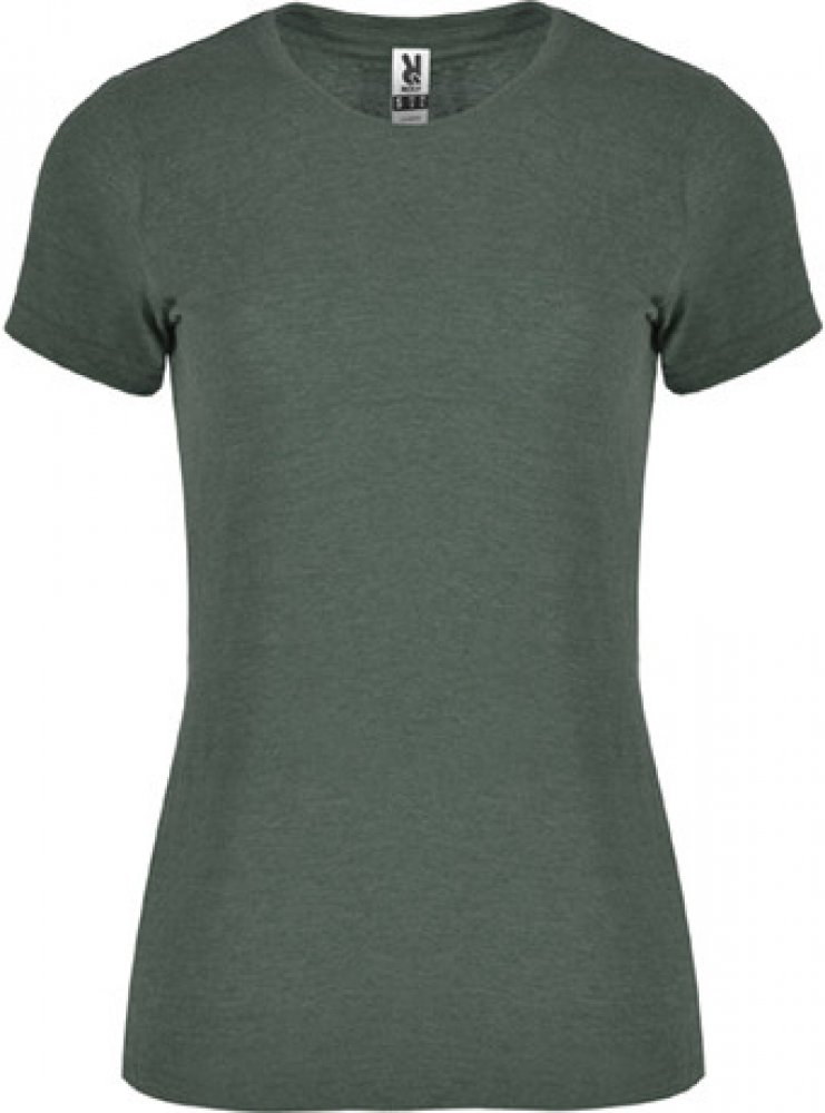 Dámské tričko s krátkým rukávem, melírová tkanina. Tričko má kulatý výstřih z žebrovaného úpletu 1x1, zpevněné kryté švy na průkrčníku, s bočními švy.