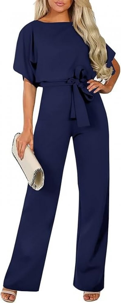 Ležérní overal s volánkovými rukávy, dlouhý kombinéza, kalhotový oblek s krátkým rukávem, kalhoty s páskem, kalhoty s kulatým výstřihem, koktejlové kombinézy, dlouhé dámské kalhotové oblečení.