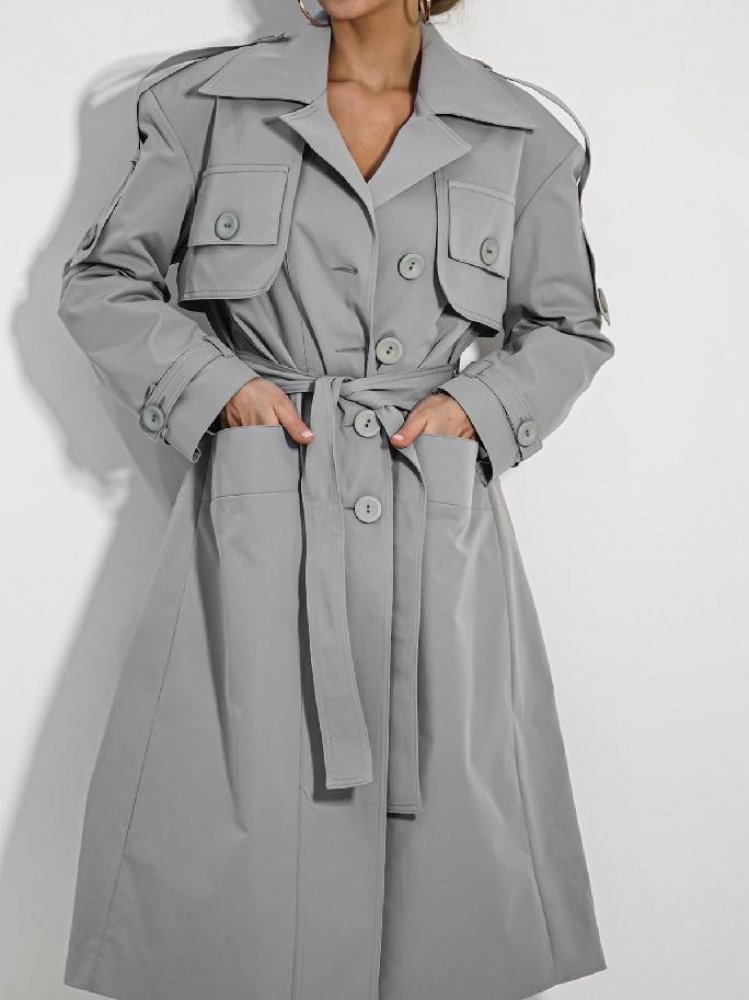 Jarní dámský plášť se zapínáním na knoflíky a utažení páskem. Dvě přední kapsy, náprsní ozdobné klopy a pásky na ramenou a rukávech...do detailu propracovaný a elegantní plášť. Ideální pro sluncem prohřáte jarní dny.
