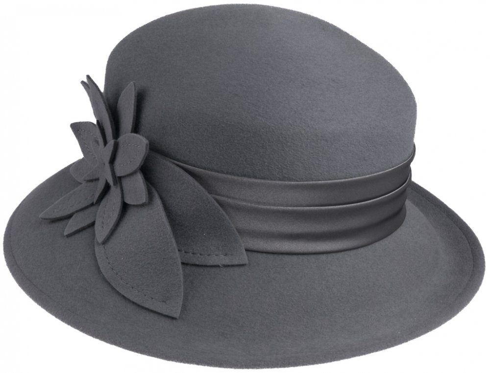 pDámský plstěný klobouk zdobený saténovou stuhou a plstěným květem, vybaven pružným potním páskem./p
