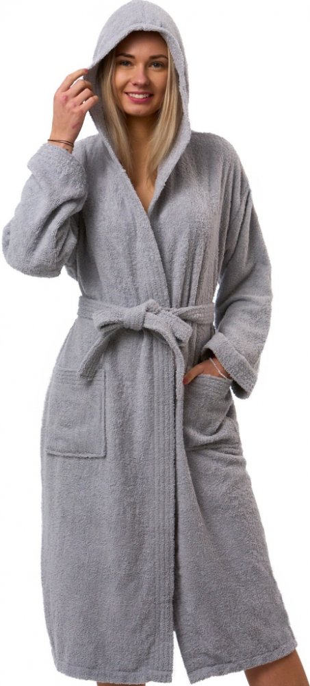 Moderní světle šedý župan ze 100% bavlněného froté. Dlouhý střih, kapuce, kapsy, pásek. Měkký a pohodlný.
