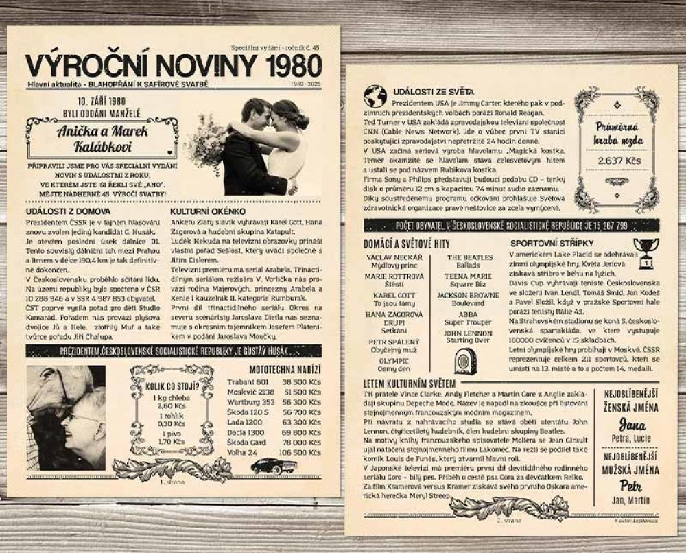 Noviny k výročí svatby nebo k výročí seznámení se skutečnými událostmi z roku 1980. Vepíši jména oslavenců i gratulaci podle vašeho přání. Rozměr každé stránky je A4 nebo A3.