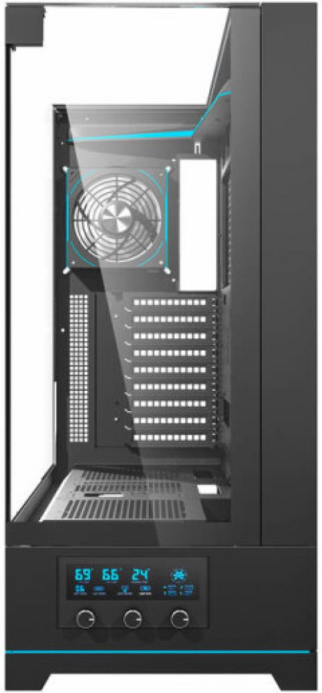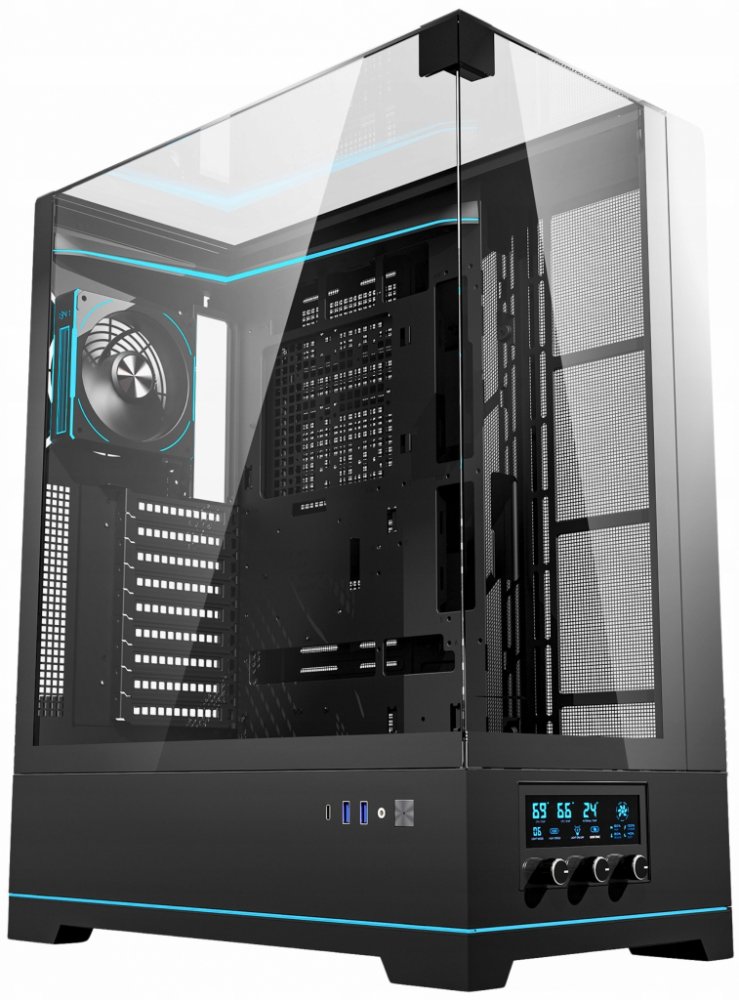 Darkflash DY450L PRO je vybavena digitálním systémem řízení teploty, který zajišťuje monitorování teplot GPU, CPU a vnitřní teploty skříně v reálném čase. Panel s knoflíky na přední straně umožňuje přesné ovládání rychlosti ventilátorů, což umožňuje optimalizovat chlazení podle zatížení systému.