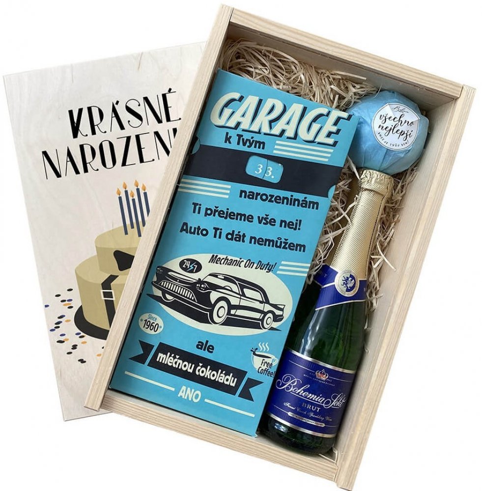 Naše dárková narozeninová bedna pro muže potěší chlapa každého věku. Díky čokoládě s otočným kolečkem můžete nastavit libovolný věk oslavence. Dárková bedna obsahuje: Šumivé víno 0,2 l dle aktuální nabídky Mléčná čokoláda k narozeninám 100 g – garage Šumivá pěnivá bomba do koupele Vše nejlepší - 100 g