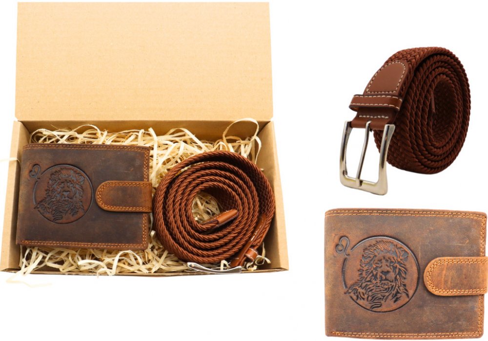 Dárková sada pro muže Kožená peněženka a elastický pásek v dárkové krabičce Lev