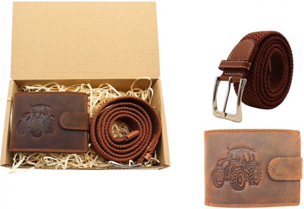 Dárková sada pro muže Kožená peněženka a elastický pásek v dárkové krabičce Traktor