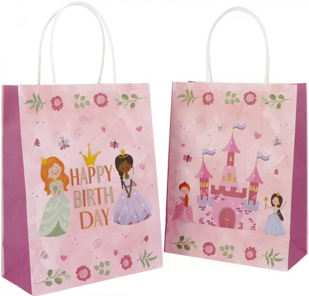Papírové dárkové tašky ve světle růžové barvě s motivem princezen s barevnými šaty, korunkami dozdobené květinami. Roztomilá kolekce Princeznovský den se hodí na narozeniny každé malé i velké princezny.????????Tip na závěr: Pro dokonalejší vzhled se nezapomeňte podívat na celou kolekci Princeznovský den a sladit vše až po nejmenší detaily do stejného motivu.