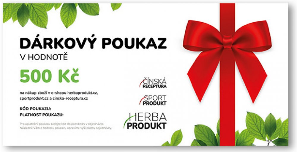Dárkový poukaz v hodnotě 500,- Kč na nákup produktů v e-shopech HERBAPRODUKT.CZ, CINSKA-RECEPTURA.CZ a SPORTPRODUKT.CZ