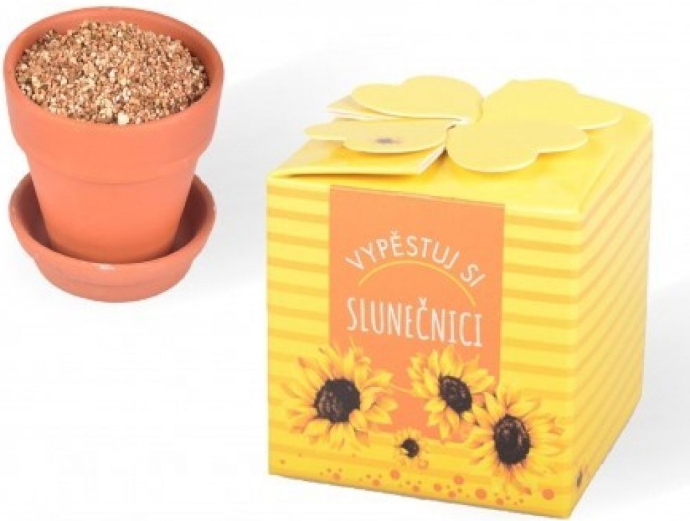 Vypěstuj si SLUNEČNICI Hledáte neobyčejný dárek pro svou rodinu nebo přátele? Dárek který udělá radost úplně každému? Máme pro Vás originální sadu na vypěstování vlastní SLUNEČNICE. Stačí jen zasadit semínka, která jsou součástí balení, přidat substrát, zalít vodou a čekat, až se Vám krásná rostlinka objeví ve vašem květináčku. Sada obsahuje: