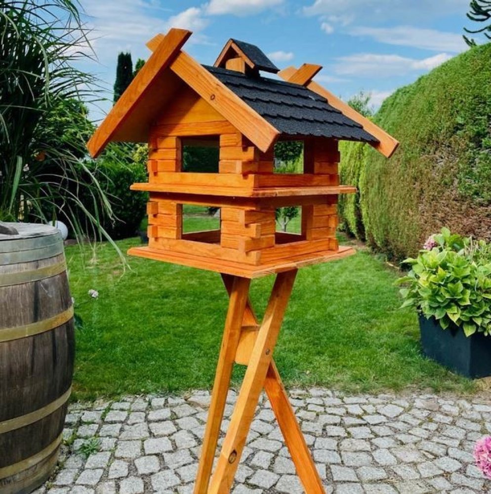 S láskou ručně vyrobený obdélníkový dvoupatrový ptačí domek vyrobený ze dřeva. S šindelovou střechou, včetně dávkovače krmiva v horní části komína. To chrání krmivo před deštěm. Dodávka je kompletně sestavena. Nejsou potřeba žádné manuální dovednosti.