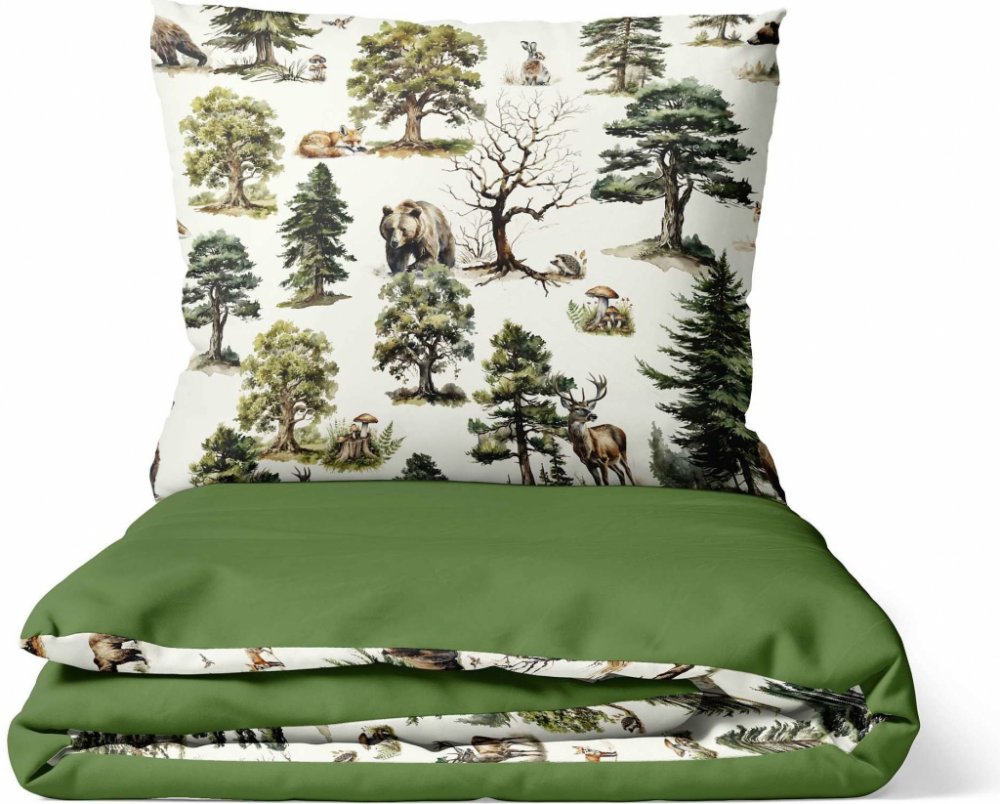 Naše povlečení je symbolem kvality a tradice šité s maximální pečlivostí přímo v České republice. Představujeme vám povlečení se vzorem Lesní říše - duo, které vás přenese do klidného lesního prostředí, kde se mezi majestátními stromy pohybují zvířata jako medvědi, srnky a lišky. Jemné detaily zobrazené na světlém podkladu přinášejí harmonii přírody přímo do vaší ložnice. Druhá strana povlečení v sytě zeleném odstínu připomíná mechový koberec lesa a dokonale ladí s motivem.