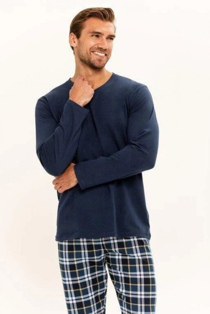 Pánské pyžamo Darren je vyrobené z kvalitního materiálu a má oblíbené kárované kalhoty. Pyžamo je vyrobené z kvalitní 100% bavlny. Má dlouhé rukávy a kulatý výstřih. Má tmavě modrou barvu u pyžamového vršku. Pyžamové kalhoty mají modrou barvu a vzor káro. V pase je pružná guma.Vyrobeno v EU.