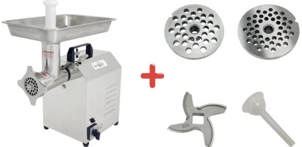 Součástí balení jsou dvě mlecí desky (Ø 6 mm a Ø 8 mm), nůž a plastová zásuvka pro plnění klobás s nátrubkem Ø 19 mm. Stroj váží 31 kg a jeho rozměry činí 490 × 305 × 607 mm, což umožňuje instalaci na pracovní stůl i v provozech s omezeným prostorem.