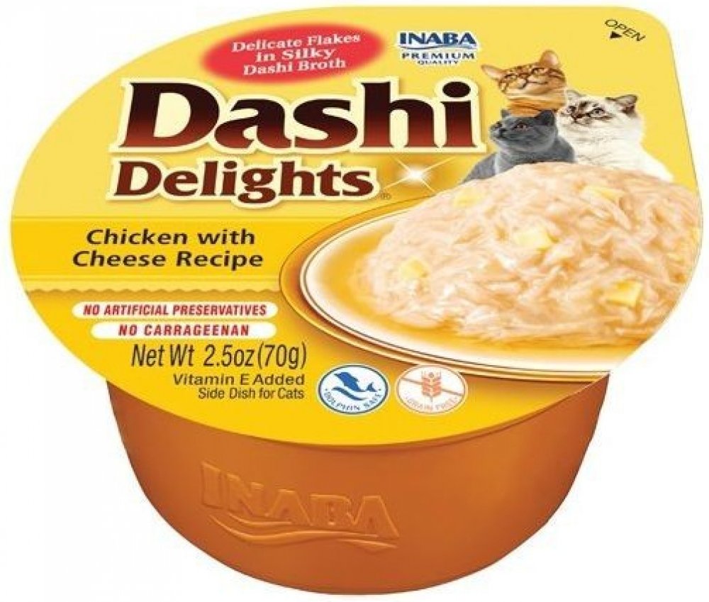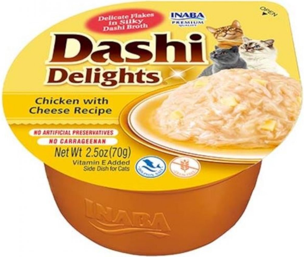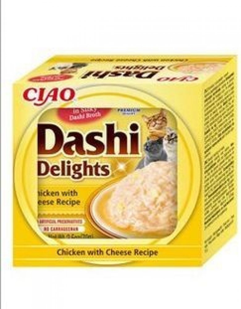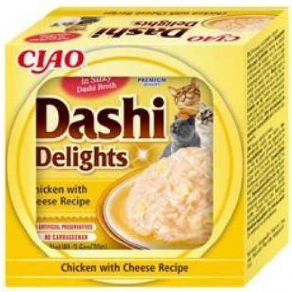 Kuřecí maso se sýrem a jemné tuňákové vločky v lahodném vývaru Dashi. Dashi je tradiční japonský rybí vývar z tuňákových vloček, který je známý svou vyjímečnou, lahodnou chutí. Zařazení Dashi do jídelníčku vaší kočky může dodat krmení nový rozměr a učinit ho vyjímečným zážitkem. Nejde jen o chuť - dashi může poskytnout i důležité živiny včetně vitaminů a minerálů. Dashi má nízký obsah kalorií a tuku, takže je zdravým doplňkem stravy vaší kočky. Je to produkt na bázi vývaru, což znamená, že obsahuje vysoké množství vody a tím pomáhá udržet zdraví vaší kočky. Dashi se může stát chutným a výživným doplňkem stravy vaší kočky, který si díky její neodolatelné chuti určitě zamiluje. Všechny produkty Inaba jsou vždy bez obilovin, zbytečných ingrediencí a pochybných přísad a jsou vyrobené z pravého mořského tuňáka a kuřat chovaných na farmách.