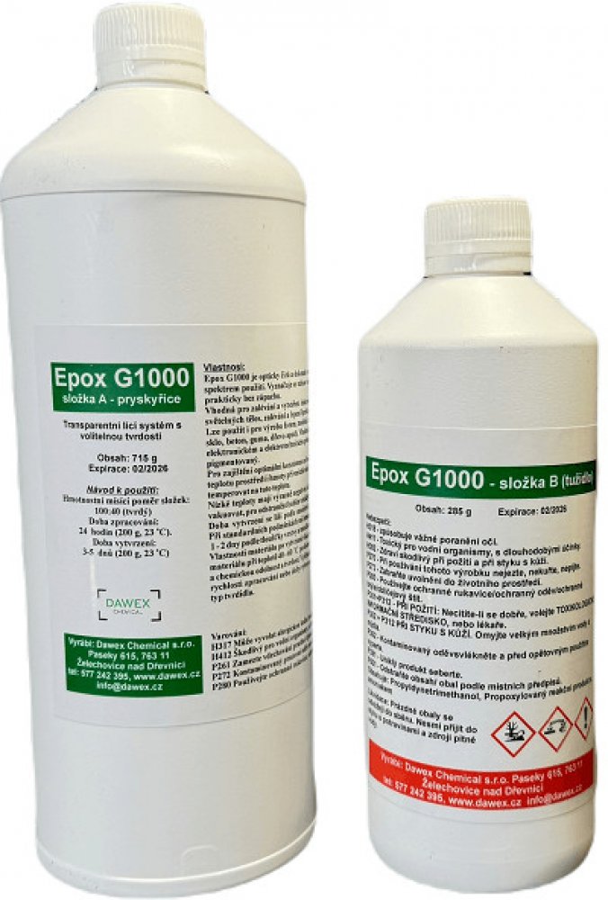 Epox G1000 je POMALU VYTVRZUJÍCÍ (rychlá se prodává pod označením G300) naprosto transparentní, průhledná a opticky čirá, UV stabilní (nežloutnoucí) licí pryskyřice na bázi epoxidu. Hmota je určena pro aplikace velmi velkého množství hmoty najednou. Lze ji odlévat v množství až 50 litrů. (Při odlévání menšího množství jsou určeny hmoty jako Epox G300 nebo G500). Hmota má mimořádně nízký exoterm a ...