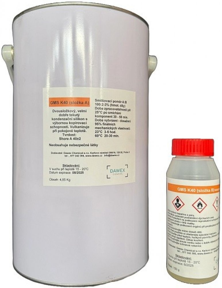 Výsledkem je středně tvrdá, deformacím odolná silikonová pryž vhodná i k odlévání velkých a rozměrných výrobků. GMS K40 se vyznačuje výbornou tekutostí, dobrým odvodem bublin a snadným odformováním. Lze dobře probarvovat pomocí GMS pigmentů.