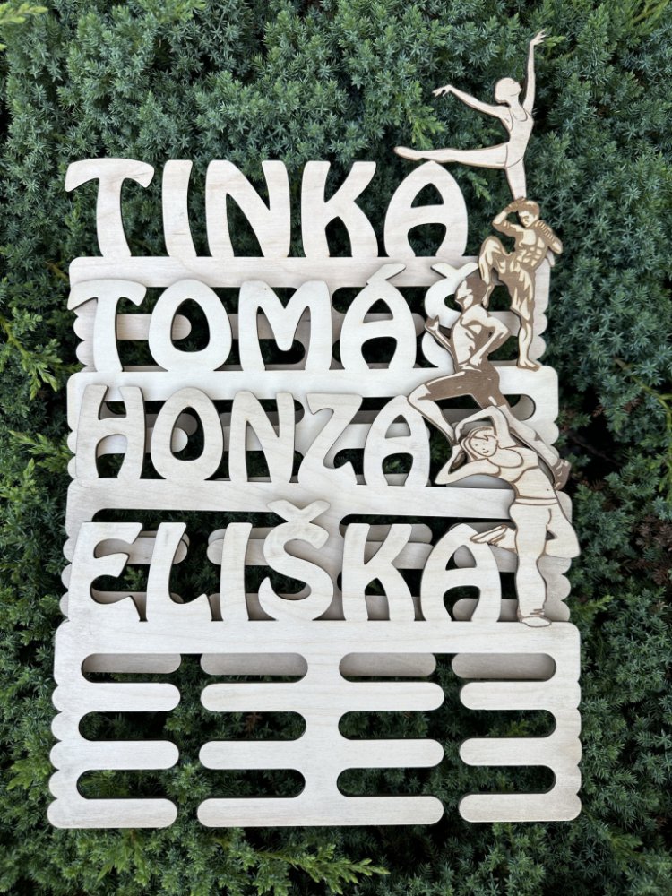 Věšák na medaile pro běh, fotbal, florbal, tanec, hasič, hokej, horské kola, cyklistika, spartan, veslování, kuželky, zápas, judo, karate, mažoretky, plavání, atletika, basketbal, volejbal, baseball, házená a mnoho dalších sportů. Vyrábíme také pro kočky, psi,...