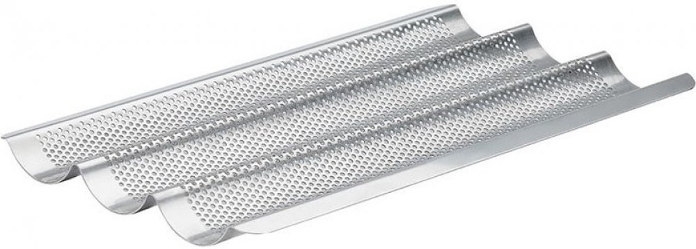 Vlastnosti:- nerezový děrovaný plech na 3 bagety, tvarovaný- ideální pro pečení baget, pro výrobu kulatých tuile nebo čokoládové zdobení- perforovaný pro optimální cirkulaci horkého vzduchu- vynikající výsledky vaření díky železu: plech dosahuje vysokých teplot, což umožňuje karamelizaci šťáv- rovnoměrný rozptyl tepla a rovnoměrné vaření- péče: mytí ručně (neabrazivní houbičkou)- velikost: 40 x 26...