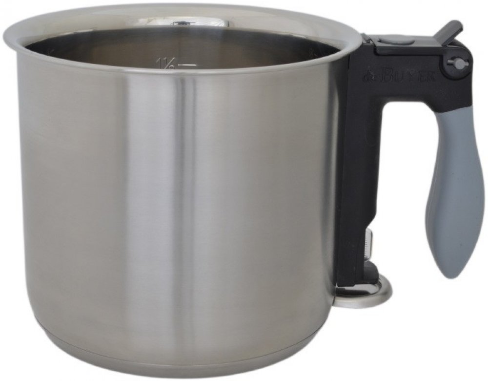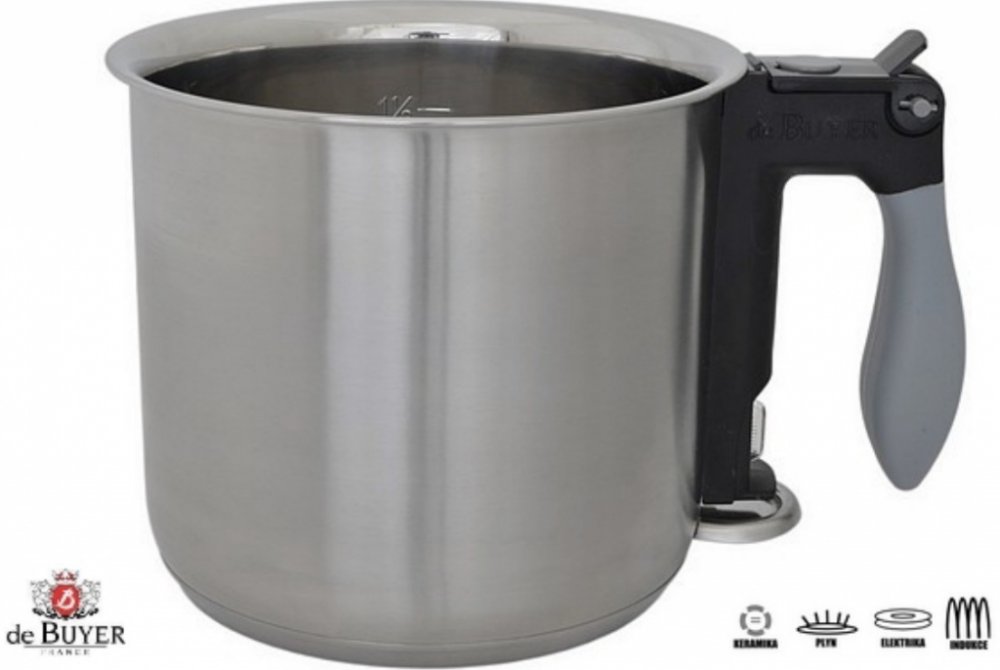 Už nebrečte nad připáleným mlékem. Společnost de Buyer pro vás vyrobila nerezový dvouplášťový hrnec, se kterým se vám podobná katastrofa už nestane. Nemusíte kvůli vodní lázni obrátit kuchyň vzhůru nohama při hledání vhodných nádob. Vodu nalijete do dutiny mezi plášti otvorem v rukojeti. Mléko, čokoláda nebo omáčka se budou prohřívat pozvolna a zabráníte tak připalování. Množství v hrnci uhlídáte ...