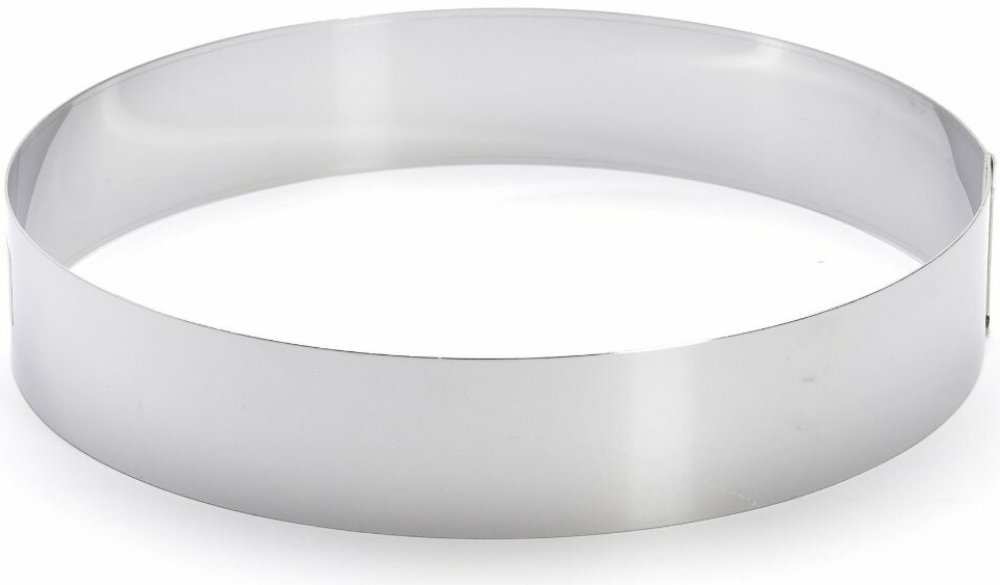 kulatý cukrářský ráfek z nerezové oceli o výšce 4,5 cm je určený pro sestavování dortů, dezertů nebo pro tvarování za studena