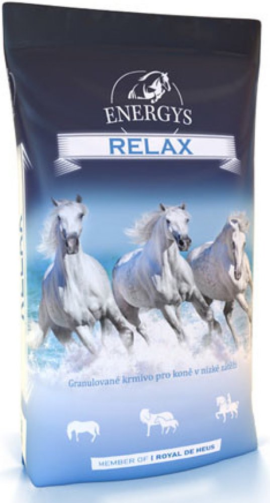 Doplňková krmná směs pro koně v nízké zátěži, pro hobby a školní koně. Je určeno především pro koně v nízké zátěži, klisny v prvních 2/3 březosti, pro školní a provozní koně v jezdeckých oddílech. Tato krmná směs je velmi vhodná jako náhrada za oves u hůře zvladatelných koní, kteří na krmení ovsem reagují neklidem a nervozitou. Tato směs má nižší obsah energie, ale dostatečně vyrovnaný obsah ostatních složek pro udržení koně v optimální kondici. Energys® Relax je velmi vhodný pro koně, po kterých požadujeme práci v klidnějším tempu nebo pouze hobby zátěž. Lépe vybalancuje poměr mezi vápníkem a fosforem.