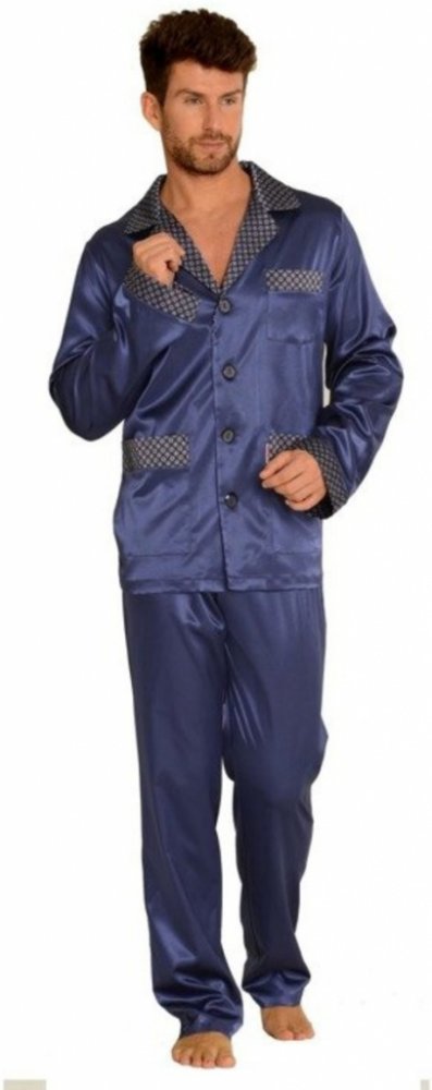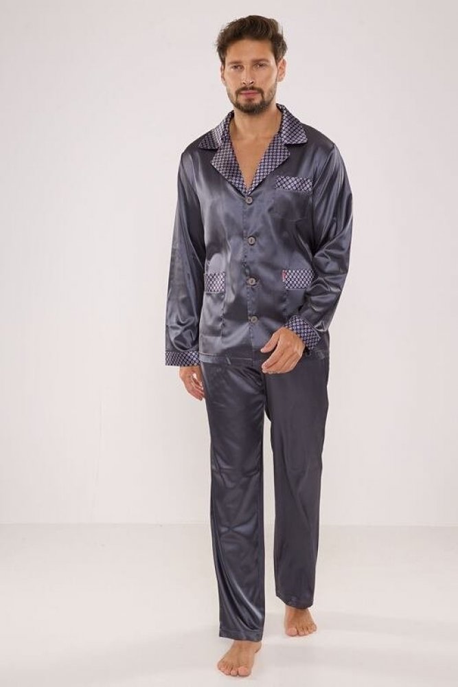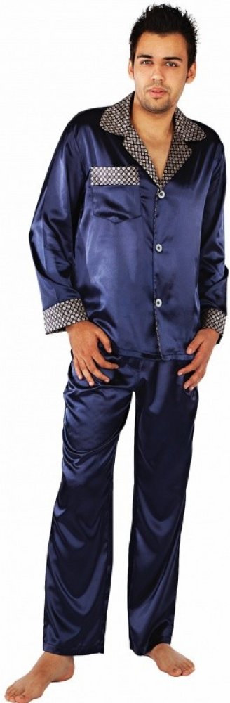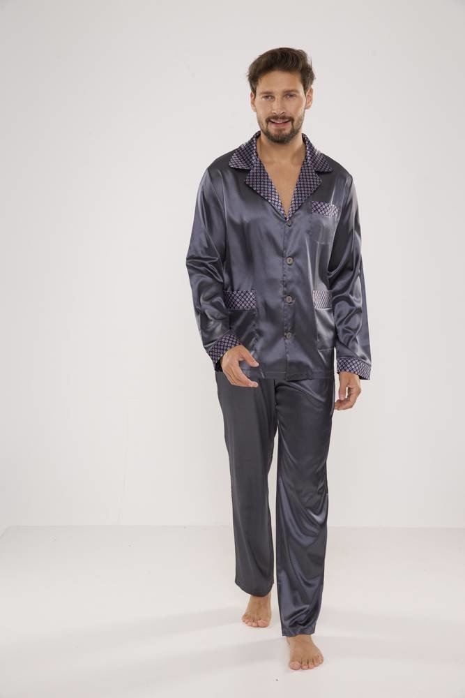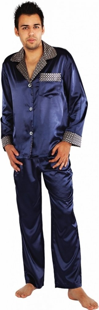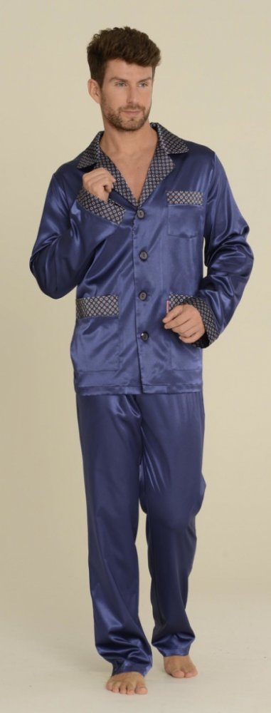 Blůza pyžama má límec, kapsy a rozepíná se. Dlouhé jednobarevné kalhoty mají na bocích dvě kapsy. Manžety, límec a kapsy jsou ozdobené vzorovaným materiálem.