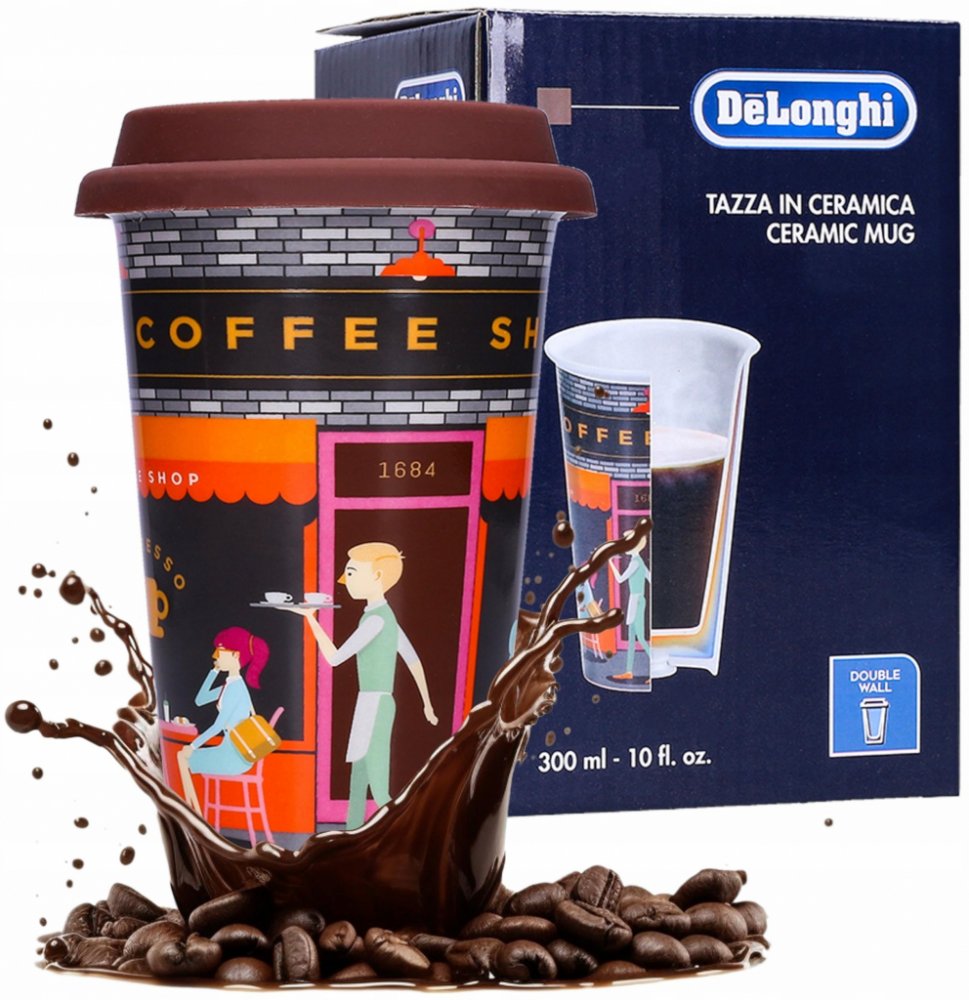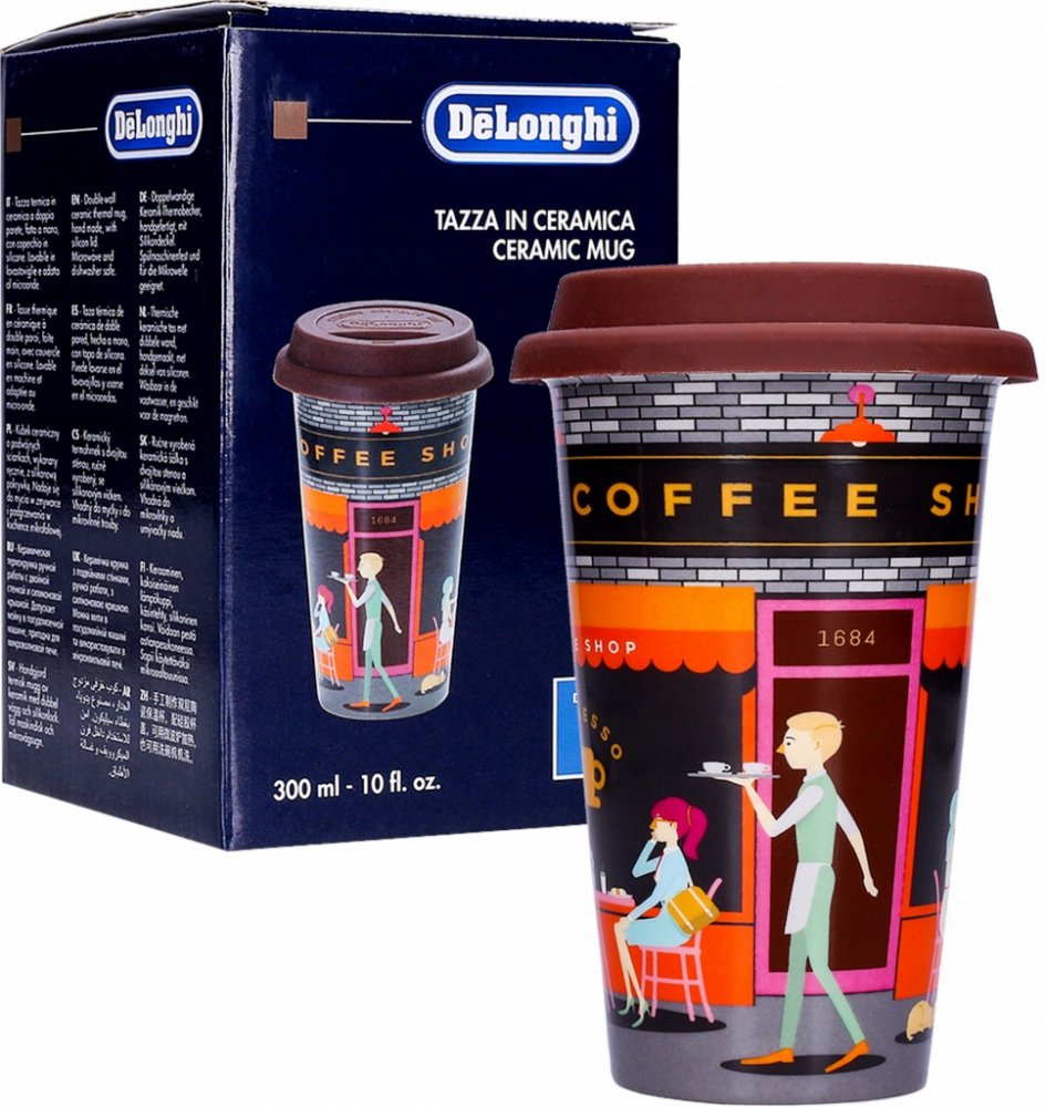 Keramický termohrnek DeLonghi 5513284501 DLSC066 "Coffee Shop"Speciální nabídka od společnosti DeLonghi pro všechny, kteří pijí kávu nebo čaj na cestách. Série keramických termohrnků DeLonghi je vytvořena s ohledem na praktické použití, kvalitní zpracování a zajímavé design návrhy. Kvalita produkce:• Hrnky jsou vyrobeny z dvojitých keramických stěn s tepelně izolačními vlastnostmi. Díky tomu udržuje hrnek DeLonghi nápoj déle teplý. Zároveň neohřívá vnější stěny a nepálí v rukách. Sada obsahuje také silikonové víčko s otvorem na pití. Víko se dobře drží na šálku, zabraňuje rozlití kávy při chůzi nebo řízení automobilu. Hrnek DeLonghi DLSC066 lze použít se silikonovým víkem nebo bez něj. Kapacita termohrnku je 300 ml a výška bez víka je 135 mm. Stylový design:• Dalším neméně důležitým aspektem termohrnku DeLonghi 5513284501 DLSC066 je jeho design. Tvarem připomíná klasický papírový kelímek s víkem, který často najdete v kavárnách, kde se podává káva nebo čaj. Silným rozlišovacím znakem této série jsou designérské tisky, které dodávají hrnku charakter a dodávají netradiční rám. Série hrnků DeLonghi obsahuje několik tematických designů. Každý zájemce si jistě najde vzor dle sebe. Nejdůležitější vlastnosti:• kapacita 300 ml;• dvojité keramické stěny s tepelně izolačními vlastnostmi, které udržují nápoj teplý;• stěny chránící ruce před popálením;• značkový barevný vzor vytištěný na hrnku.DeLonghi je italská společnost, která je na trhu již více než 100 let. Společnost byla založena v roce 1902 v italském Trevisu a od roku 1950 formálně působí na trhu pod názvem DeLonghi. Společnost již mnoho let vyrábí domácí spotřebiče a příslušenství. Po celém světě je spojován s automatickými tlakovými kávovary i se sklenicí na podávání kávy nebo čaje. Díky dobrým výrobkům a vysoké kvalitě se stal jedním ze světových lídrů v segmentu zařízení a příslušenství souvisejících s kávou.V nabídce naší rodinné firmy Penepex najdete široký výběr produktů DeLonghi. Máme mimo jiné sklenice na espresso, latte nebo capuccino, příslušenství pro čištění kávovarů, odvápňovače, filtry do kávovarů, sítka, nádoby na mléko aj.