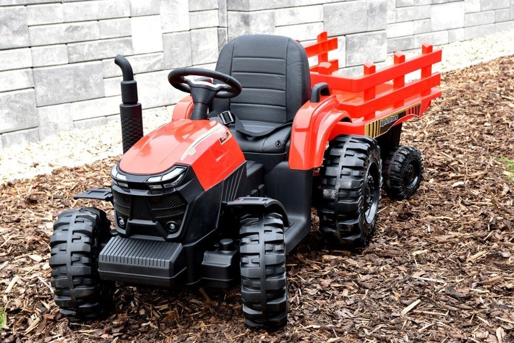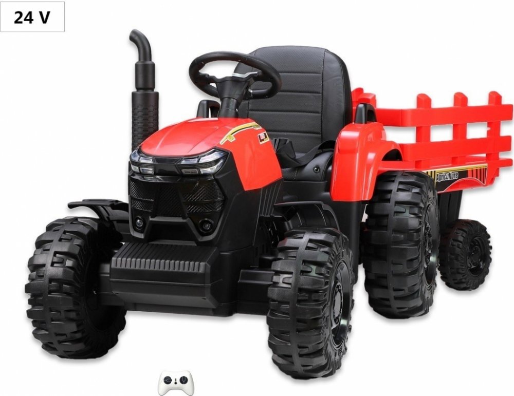 Elektrický 24V traktor Agricultur s vlekem, 2,4G bluetooth dálkové ovládání, EVA gumová kola, USB, voltmetr, LED osvětlení, čalouněná sedačka s pásem, 2x motor 24V/200W, baterie 24V/7Ah