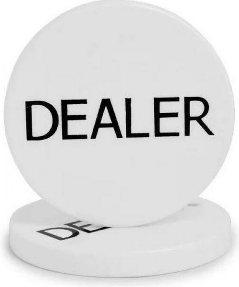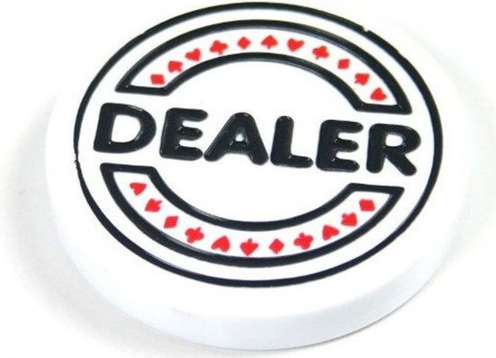 Žeton Dealer Button označuje hráče, který právě rozdává pokerové karty. Žeton Dealer Button bílý Dealer Button – žeton – určuje aktuálního dealera. Dealer je hráč, který míchá a rozdává karty. Před první hrou se určí tak, že si všichni hráči vytáhnou jednu kartu a ten s kartou nejvyšší se stává dealerem. Každou hru se dealer mění kolem stolu po směru hodinových ručiček. Průměr: 49 mm Tloušťka: 5,5...