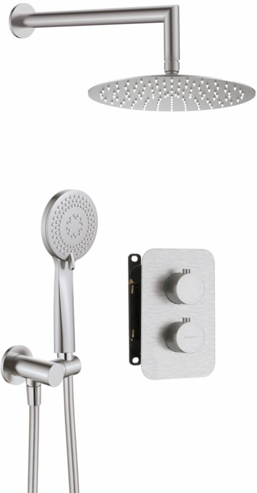 Sprchová souprava obsahuje rukojeť s hadicí a madlem, ultra tenkou sprchovou hlavici a termostatický box, což představuje kompletní řešení pro každou moderní koupelnu.