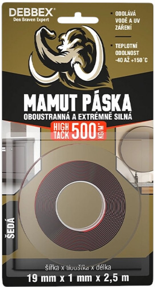 Páska lepicí oboustranná 19mm/2,5m Mamut High Tack Debbex Extrémně silná oboustranná lepicí páska pro lepení široké škály podkladů. okamžitá plná přídržnost urychluje montáž a uvedení lepeného předmětu do provozu vhodná do automoto, stavebního a strojírenského průmyslu i domácnosti nahrazuje kartušová lepidla hodí se pro lepení zrcadel a koupelnových doplňků, poliček a těžších předmětů, cedulí a š...